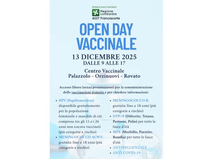 ASST Franciacorta informa che sono stati organizzati tre nuovi Open Day vaccinali sul territorio. L’iniziativa si terrà sabato 13 dicembre 2025, dalle 9 alle 17, con accesso libero e senza necessità di prenotazione.