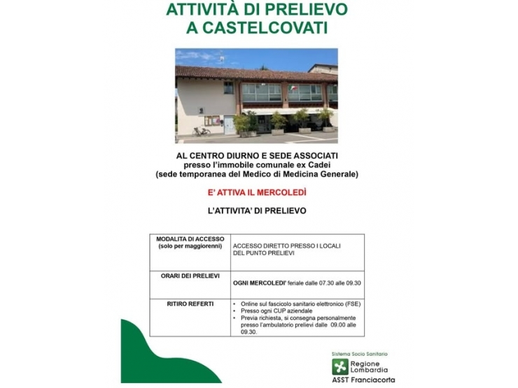 ASST Franciacorta ha comunicato che dallo scorso 18 novembre sono cambiate le modalità di accesso all'attività del Punto Prelievi di Castelcovati.