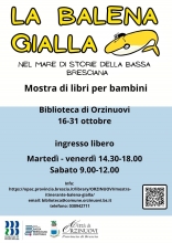 Fino al 31 ottobre i locali della Biblioteca Civica di Orzinuovi ospiteranno la mostra bibliografica itinerante “Balena Gialla”, organizzata dal Sistema Bibliotecario della Bassa Bresciana e comprensiva di più di un centinaio di volumi dedicati principalmente ai bambini delle scuole elementari. Ripartiti in cinque sezioni tematiche, unite dal comune riferimento al colore giallo, i libri saranno non solo a disposizione delle scuole che già hanno aderito all’iniziativa con visite dedicate, ma anche a tutti gli utenti – specie famiglie ed educatori – che vorranno vivere un momento di formazione e crescita con i loro piccoli lettori.
