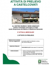 L'attività di prelievo, che si svolge presso il Centro Diurno e Sede Associati, situato nell'immobile comunale ex Cadei (sede temporanea del Medico di Medicina Generale), ora prevede l'accesso diretto con impegnativa del Medico di Medicina Generale.