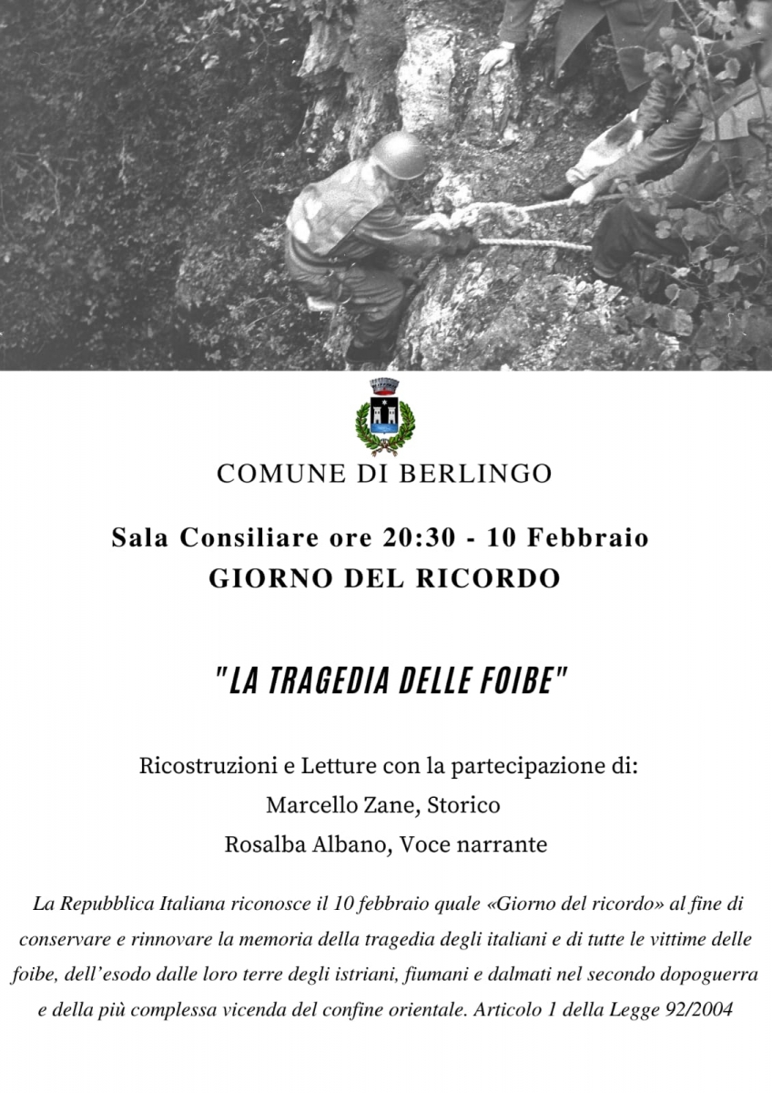 Dopo il sentito e partecipato incontro dello scorso 27 gennaio organizzato per ricordare le vittime della Shoà, Marcello Zane e Rosalba Albano torneranno nella Sala Consiliare del Comune di Berlingo per raccontare un'altra pagina nera della nostra storia: la tragedia delle Foibe. Appuntamento lunedì 10 febbraio nella Sala Consiliare alle 20.30 per la Giornata del Ricordo.
